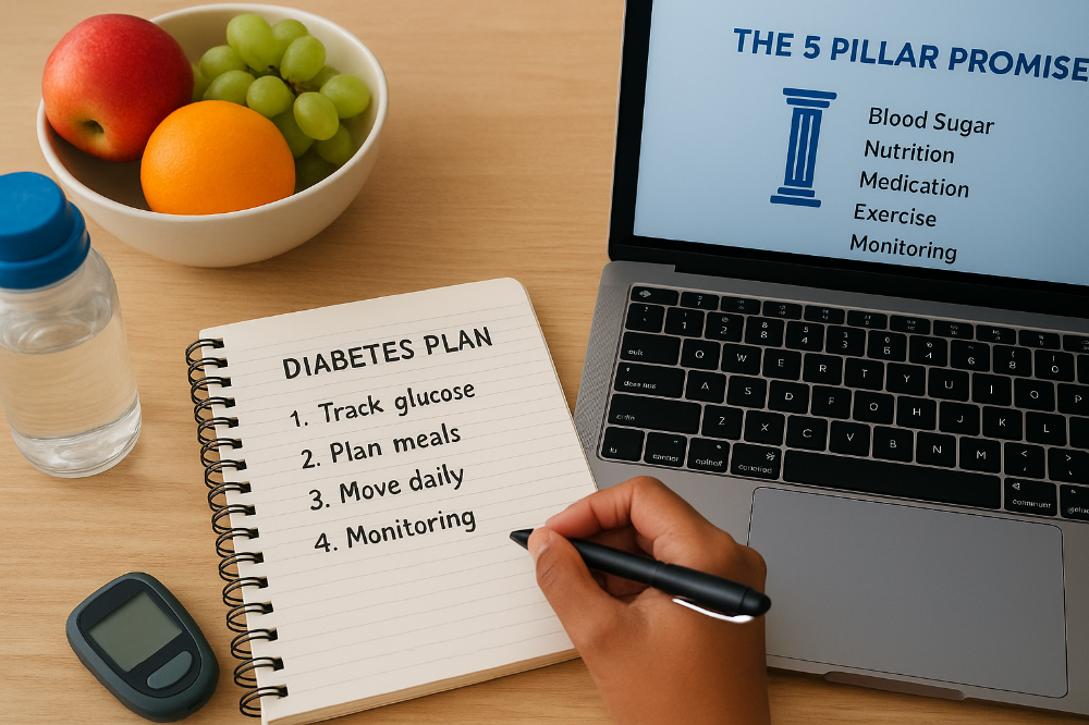 Over time, that work became the foundation of The 5 Pillar Promise For Better Diabetes Self-Management In Adults Type 1, 1.5 or 2—a course created to give people the clarity, structure and confidence I wish I’d had when I first heard, “You have diabetes.”